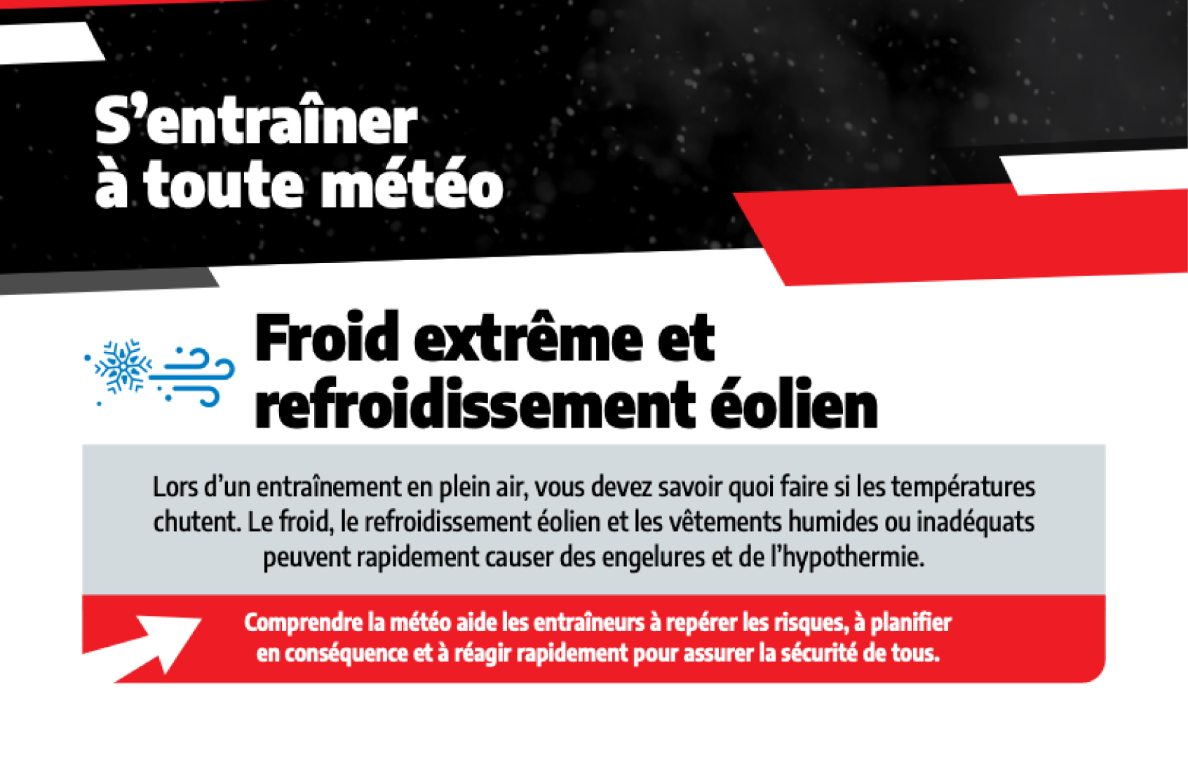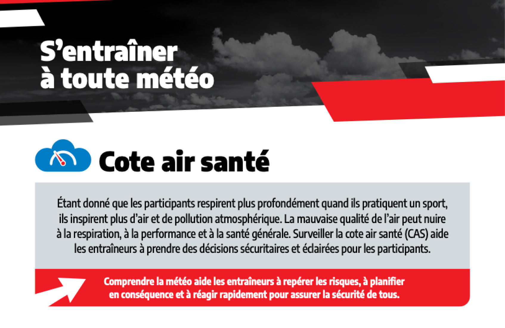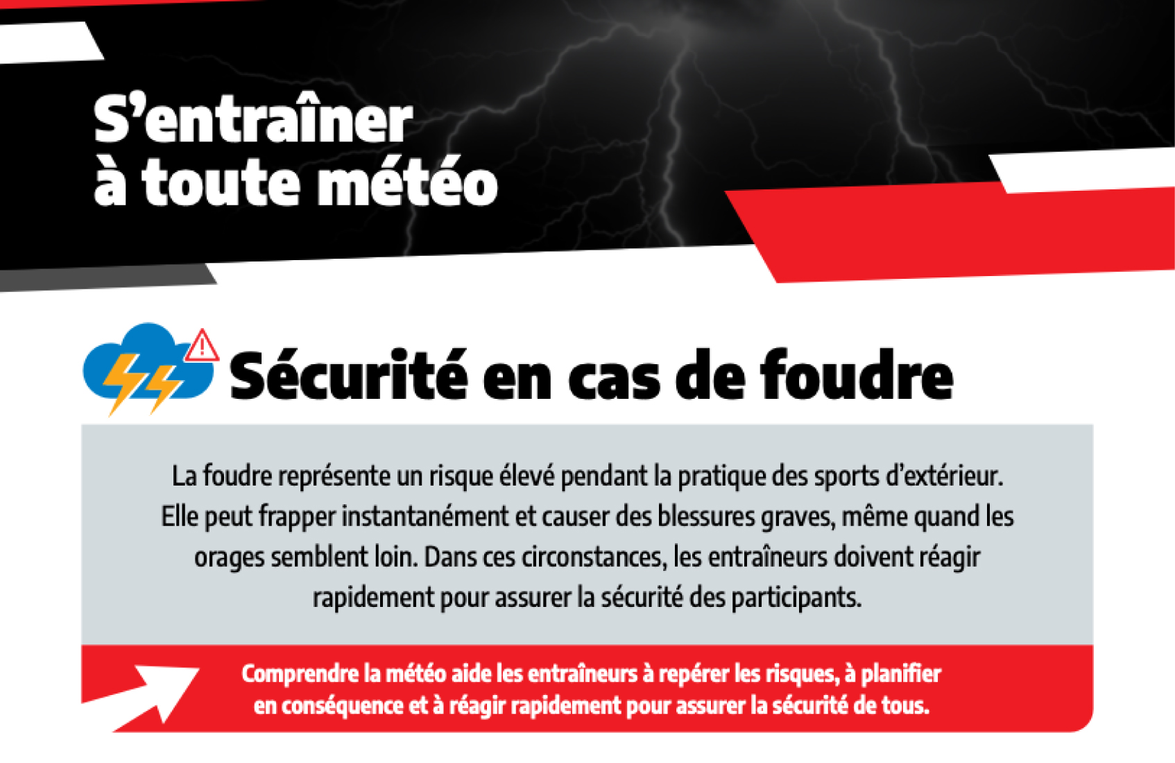Comprendre la météo et ses impacts est une compétence essentielle pour les entraîneurs et les administrateurs. Les entraîneurs jouent un rôle clé dans la protection du bien-être des participants, ils doivent donc comprendre les alertes météo (les veilles, les avis et les avertissements) pour prendre des décisions plus sécuritaires et plus éclairées avant et pendant les activités à l’extérieur.