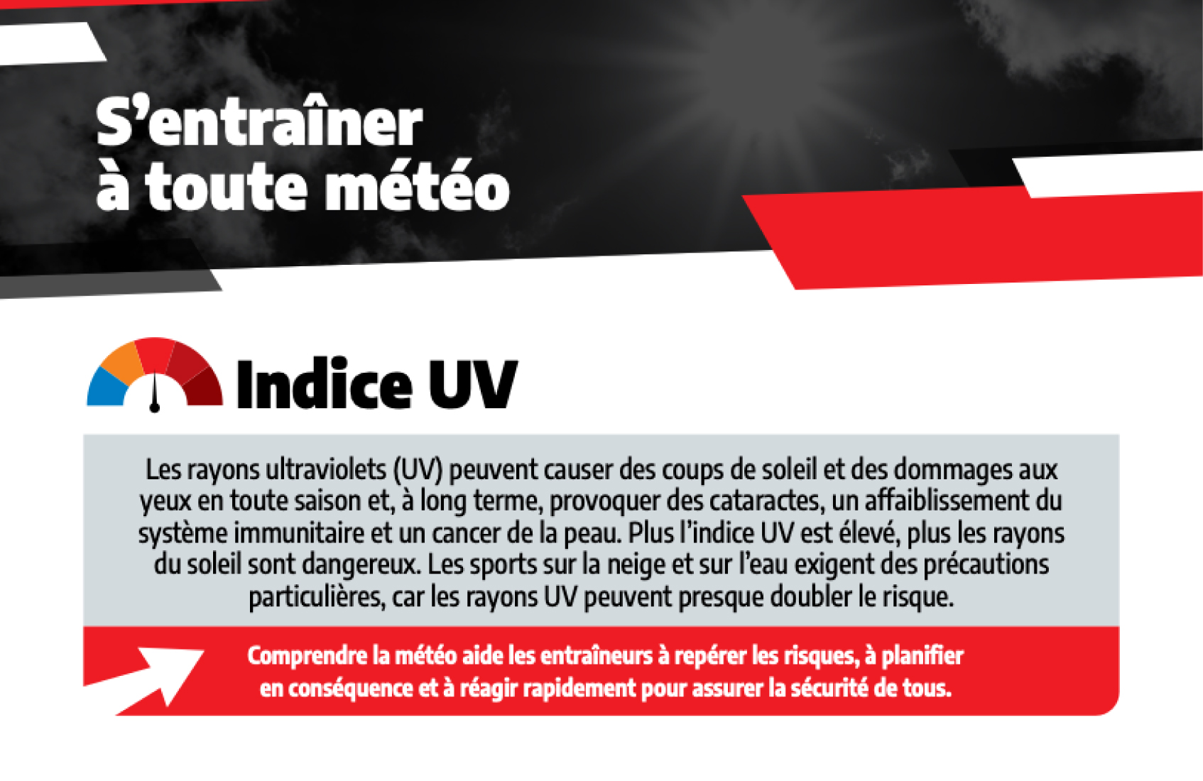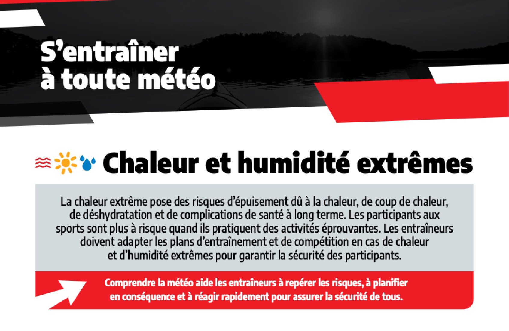 Comprendre la météo et ses impacts est une compétence essentielle pour les entraîneurs et les administrateurs. Les entraîneurs jouent un rôle clé dans la protection du bien-être des participants, ils doivent donc comprendre les alertes météo (les veilles, les avis et les avertissements) pour prendre des décisions plus sécuritaires et plus éclairées avant et pendant les activités à l’extérieur.